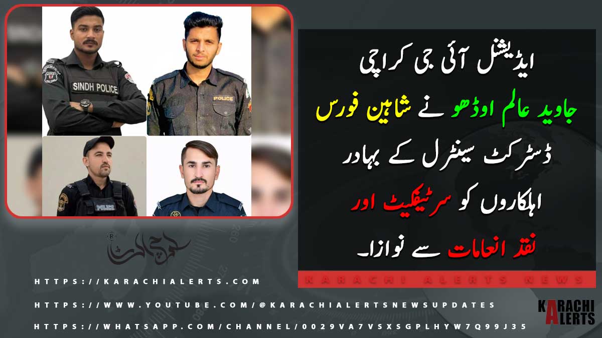 ایڈیشنل آئی جی کراچی جاوید عالم اوڈھو نے شاہین فورس ڈسٹرکٹ سینٹرل کے بہادر اہلکاروں کو سرٹیفکیٹ اور نقد انعامات سے نوازا۔