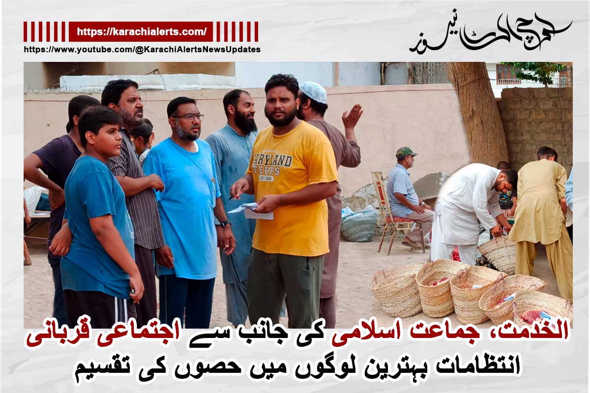 تفصیلات کے مطابق ہر سال کی طرح اس سال بھی بکر عید کے موقعہ پر جماعت اسلامی، الخدمت کی جانب سے اجتماعی قربانی کا احتمام کیا گیا۔ یہ احتمام نارتھ ناظم آباد یوسی نمبر 02، سخی حسن کے قریب سابقہ مغل گارڈن میں کیا گیا۔