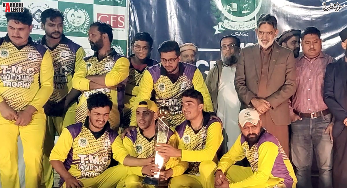 چیئرمین نیو کراچی ٹاؤن محمد یوسف نے وائس چیئرمین شعیب بن ظہیر کے ہمراہ ونر ٹیم کو ٹی ایم سی کرکٹ چیمپیئن ٹرافی دی۔