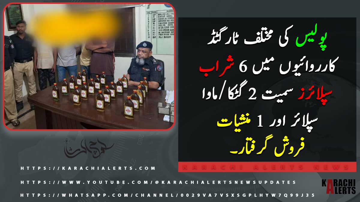 کراچی : ڈسٹرکٹ سٹی پولیس کی مختلف ٹارگٹڈ کارروائیوں میں 6 شراب سپلائرز سمیت 2 گٹکا/ماوا سپلائر اور 1 منشیات فروش گرفتار۔ ملزمان سے 27 شراب کی بوتلیں، 15 کلو سے زائد گٹکا/ماوا، اور 540 گرام چرس برآمد کی گئیں۔ ملزمان کو تھانہ عیدگاہ، بغدادی، چاکیواڑہ، رسالہ، اور نیپئر کی حدود سے گرفتار کیا گیا۔