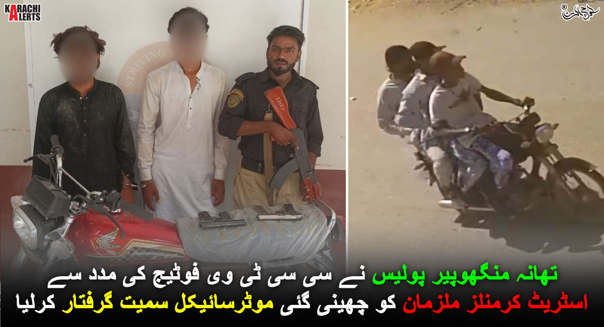 تھانہ منگھوپیر پولیس نے سی سی ٹی وی فوٹیج کی مدد سے اسٹریٹ کرمنلز ملزمان کو چھینی گئی موٹرسائیکل سمیت گرفتار کرلیا۔