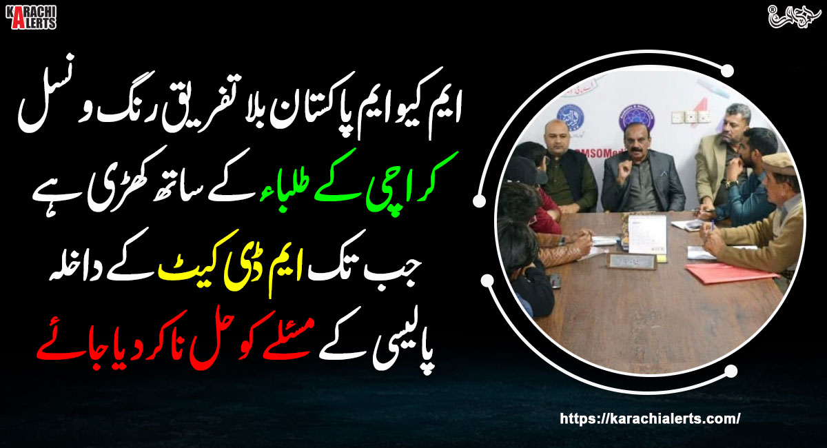 کراچی : متحدہ قومی موومنٹ پاکستان کے مرکز بہادرآباد پر ایم ڈی کیٹ کے طلباء کی والدین کے ہمراہ آمد سینئررہنماء شبیر قائم خانی و دیگر سے ملاقات۔ملاقات میں قائد حزب اختلاف برائے سندھ اسمبلی علی خورشیدی، حق پر ست رکن سندھ اسمبلی نجم مرزا، اے پی ایم ایس او مرکزی سینئر جوائنٹ انچارج ریحان شاہ و اراکین شامل تھے۔ملاقات میں آنے والے طلباء نے ایم ڈی کیٹ میں ہونے والی بے ضابطگیوں اور خدشات سے آگاہ کیا۔انکا کہنا تھا کہ ڈاؤ میڈیکل یونیورسٹی کو ایم ڈی کیٹ پیپر لیک ہونے کے باوجود ایم بی بی ایس اور بی دی ایس کے داخلوں کیلئے ذمہ داری دے دی گئی ہے جو کہ باعث تشویش اور میرٹ کا قتل عام ہے ساتھ اسکے کراچی کے طلباء کی نشستوں پر بھی جعلی ڈومیسائل کے ذریعے داخلے لئے جارہے ہیں۔ جس کوسندھ حکومت کی حمایت شامل ہے۔