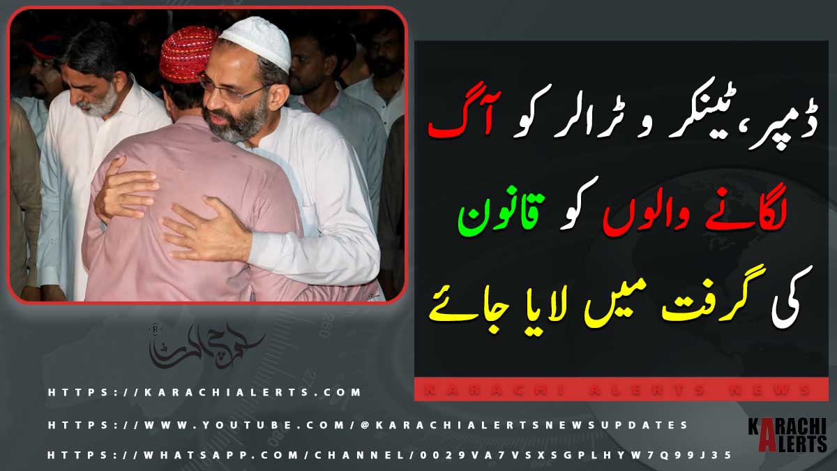 انہوں نے مزید کہا کہ کراچی میں آئے روز ہیوی ٹریفک کے حادثات ہورہے ہیں اور سینکڑوں شہری جاں بحق ہوچکے ہیں، پیپلزپارٹی کی صوبائی حکومت 17سال سے سندھ پر قابض ہے۔انہوں نے کہاکہ کراچی کے شہریوں کو آگ اور خون سے کھیلنے والوں کی ضرورت نہیں،ماضی میں شہر کو تباہ وبرباد کرنے اور امن و امان خراب کرنے والے چاہتے ہیں کہ کراچی کے امن کو ایک بار پھر سے تباہ و برباد کیا جائے، سازشوں کے تانے بانے پہلے سے ہی بنے ہوئے ہیں۔ گزشتہ رات ڈمپر،ٹینکر و ٹرالر کو آگ لگائی گئی، اس کے پیچھے جو بھی عناصر ہیں،قانون نافذ کرنے والوں کی ذمہ داری ہے کہ انہیں قانون کی گرفت میں لائیں اور ان کے خلاف سخت کاروائی کی جائے۔