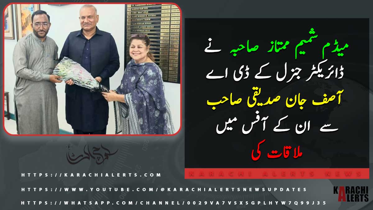 تفصیلات کے مطابق پاکستان پیپلز پارٹی سندھ خواتین ونگ کی نائب صدر، سابق صوبائی وزیر میڈم شمیم ممتاز صاحبہ کی اپنی ٹیم کے ہمراہ ڈائریکٹر جنرل کے ڈی اے جناب اصف جان صدیقی صاحب