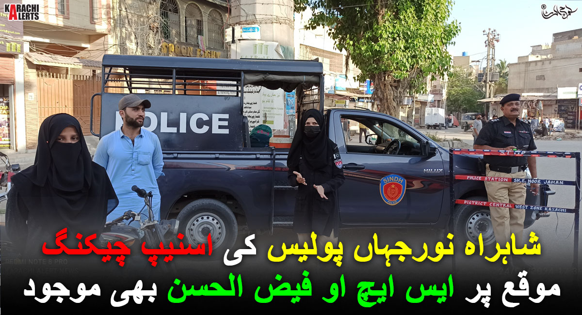 کراچی : شاہراہ نورجہاں پولیس کی طرف سے مختلف مقام پر اسنیپ چیکنگ۔ اسنیپ چیکنگ کے دوران ایس ایچ او شاہراہ نورجہاں فیض الحسن بھی موجود۔ انڈا موڑ کے پاس مین شاہراہ کے دونوں طرف بیرئر لگا کر اسنیپ چیکنگ کی گئی۔
