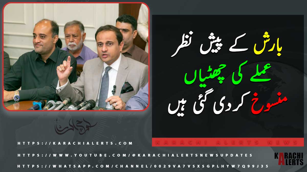میئر کراچی بیرسٹر مرتضیٰ وہاب نے مزید کہا کہ بارش کے پیش نظر عملے کی چھٹیاں منسوخ کردی گئی ہیں اور مشینری و عملہ ہر صورتِ حال سے نمٹنے کے لیے سڑکوں پر موجود ہے۔
